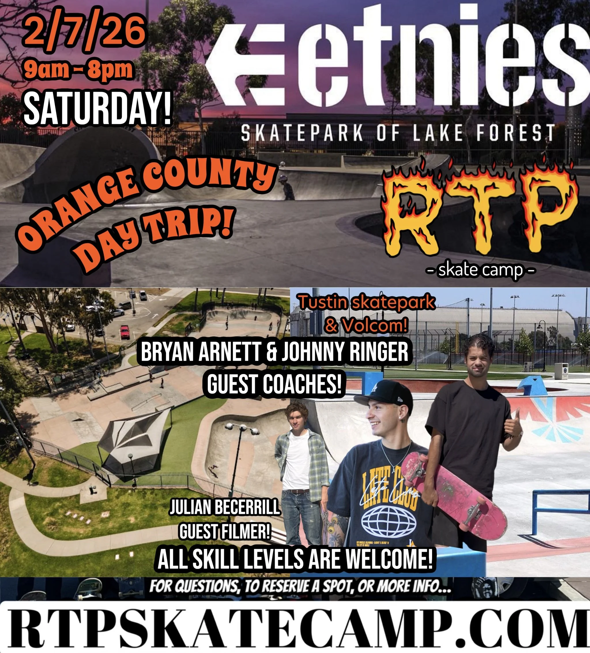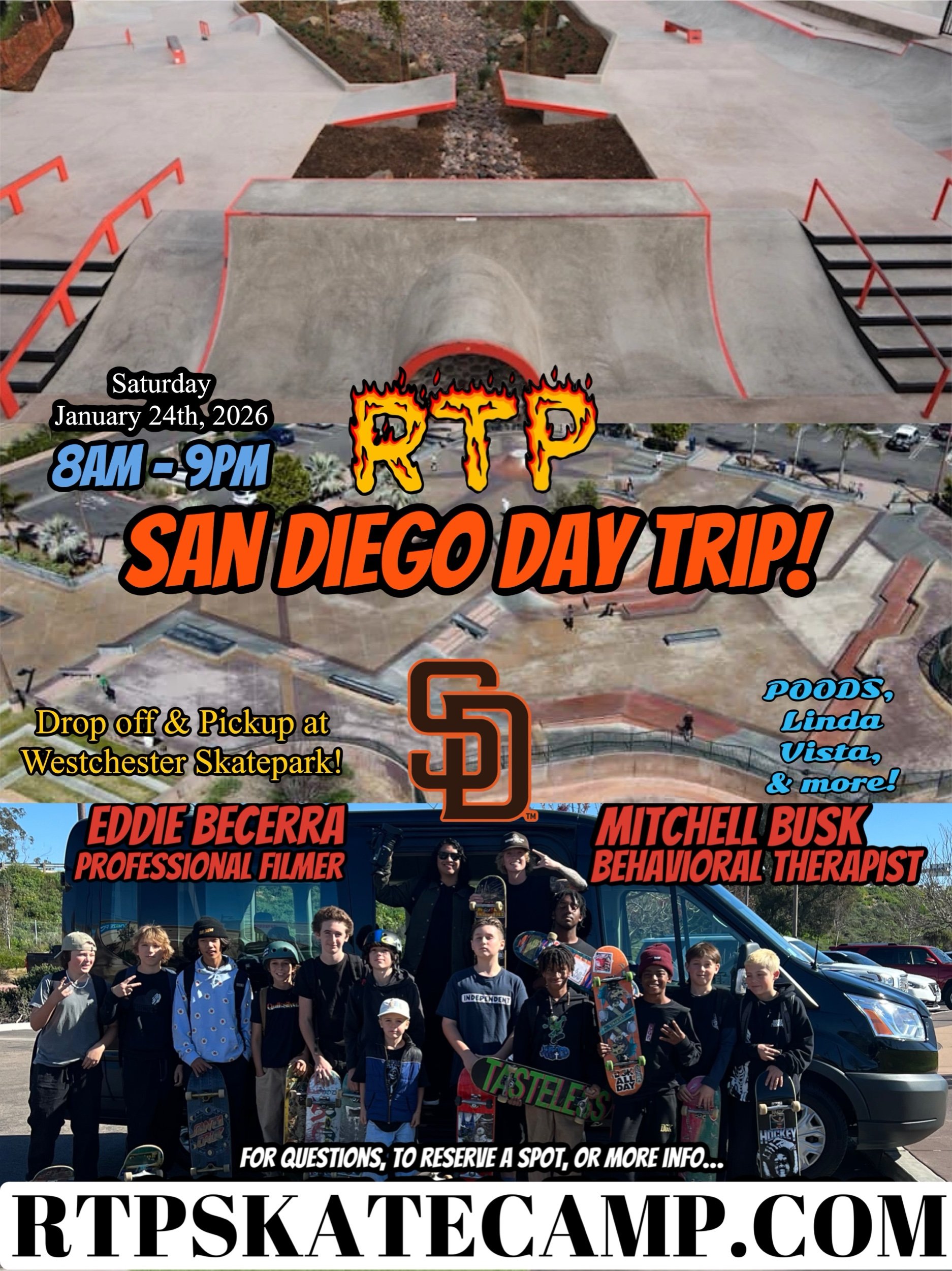 Sign Up Categories: All Day Trip All | Day Trip | LOCAL LA DAY TRIP 2/21 $150.00 Purchase Added! Orange County Day Trip 2/7/26 $150.00 Purchase Added! SAN DIEGO DAY TRIP 1/24/26 $200.00 Purchase Added! RTP T-SHIRT $30.00 View Options RTP BEANIE $25.00 Purchase Added! RTP Donation Level 1 $250.00 Purchase Added!